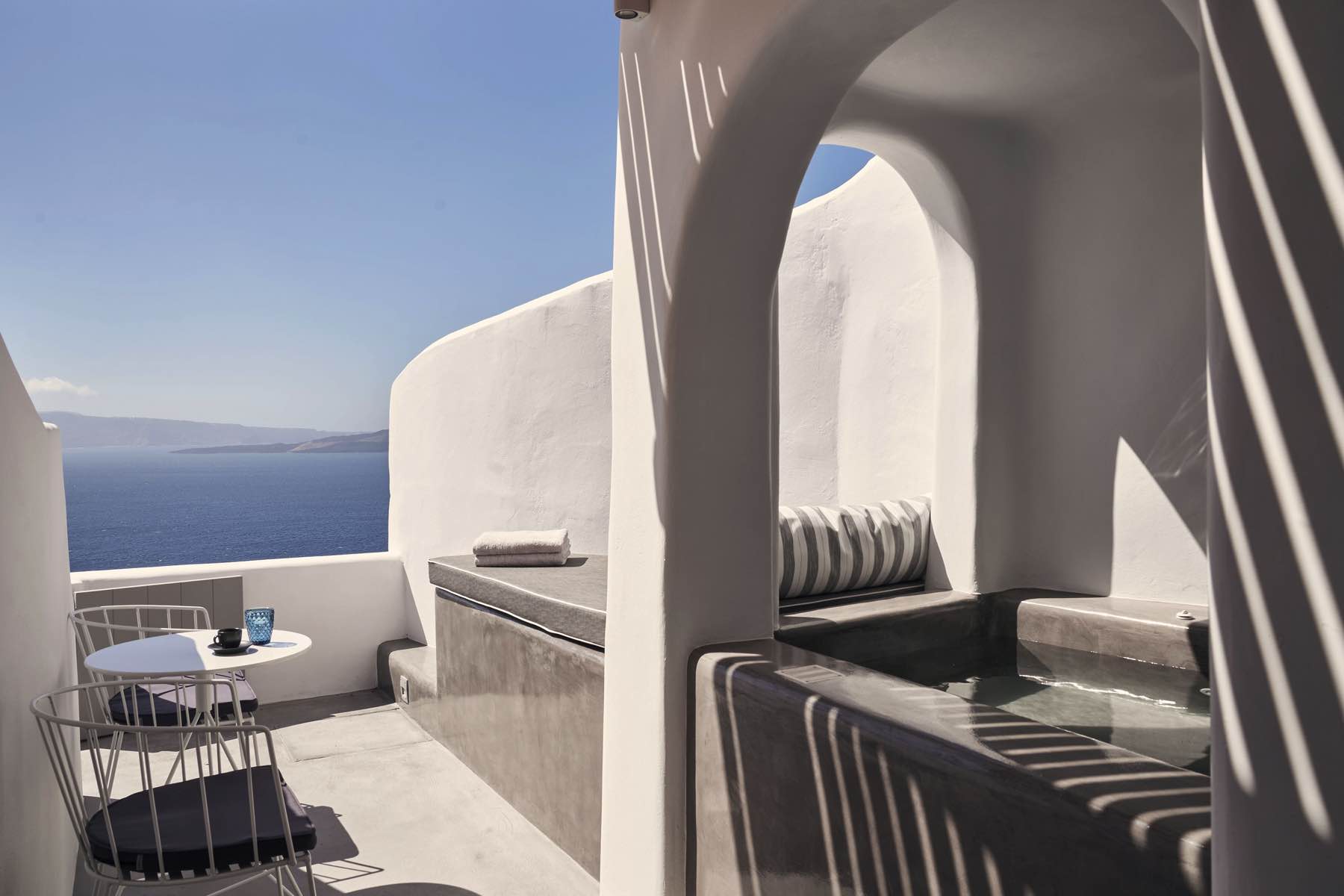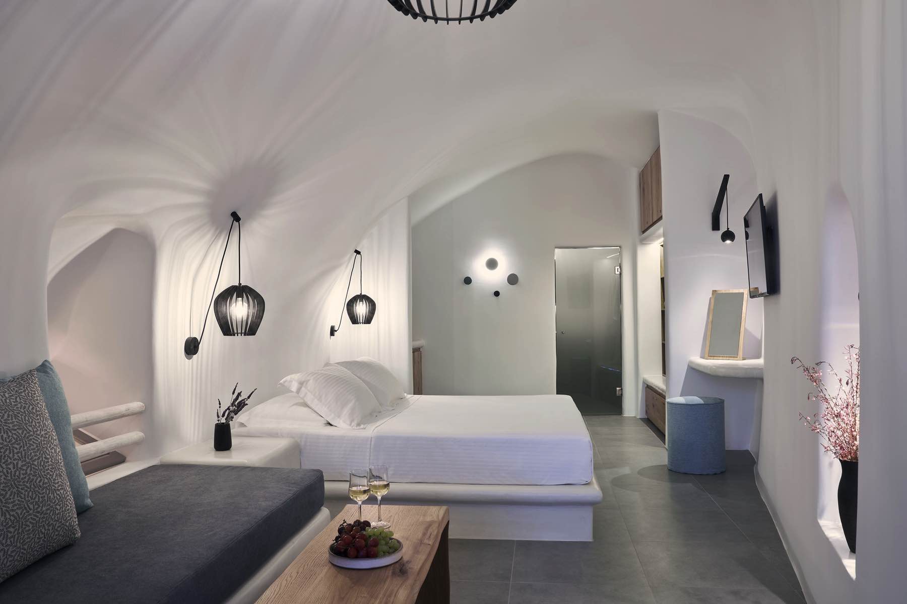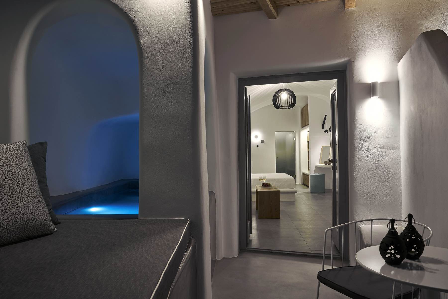 Bleding the architectural wonder of Oia’s cavehouses with liberating simplicity, the Alisaris Superior Suite is a sensational accommodation proposal designed to wow. Lavishly elegant yet pure and uncomplicated, this suite captures the eye and the heart from the moment you step into its pristine indoors. A King Size bed with an en-suite bathroom and a sitting area are your stay’s essentials, but what truly makes this suite extraordinary is the heated mini plunge pool, which flows you through a secret passage outdoors to your private slice of heaven, your terrace with breath-taking views to the sea and the volcano.